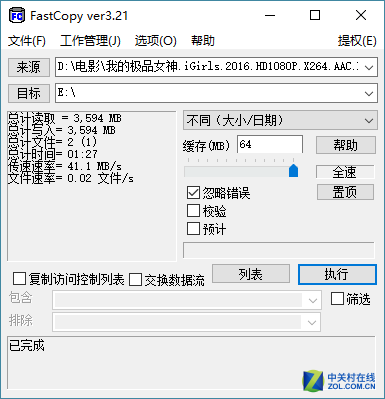 那么兩者在實際使用中表現(xiàn)如何呢?我們使用Fastcopy軟件來測試傳統(tǒng)移動硬盤和三星移動SSD T3,拷貝一部3.5GB電影,兩者的成績?nèi)缦拢?