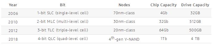 早在2017年東芝和西部數(shù)據(jù)就聲稱成功研發(fā)的64層QLC BiCS3(4-bit)架構(gòu)存儲密度可提高到768Gb,在2018下半年量產(chǎn)的96層3D QLC,單Die容量更是高達(dá)1.33Tb。美光和英特爾推出的64層3D NAND也可以達(dá)到1Tb,在各大原廠QLC 3D NAND陸續(xù)量產(chǎn)之后,QLC拉開取代TLC的序幕,猶如TLC取代MLC一樣。
